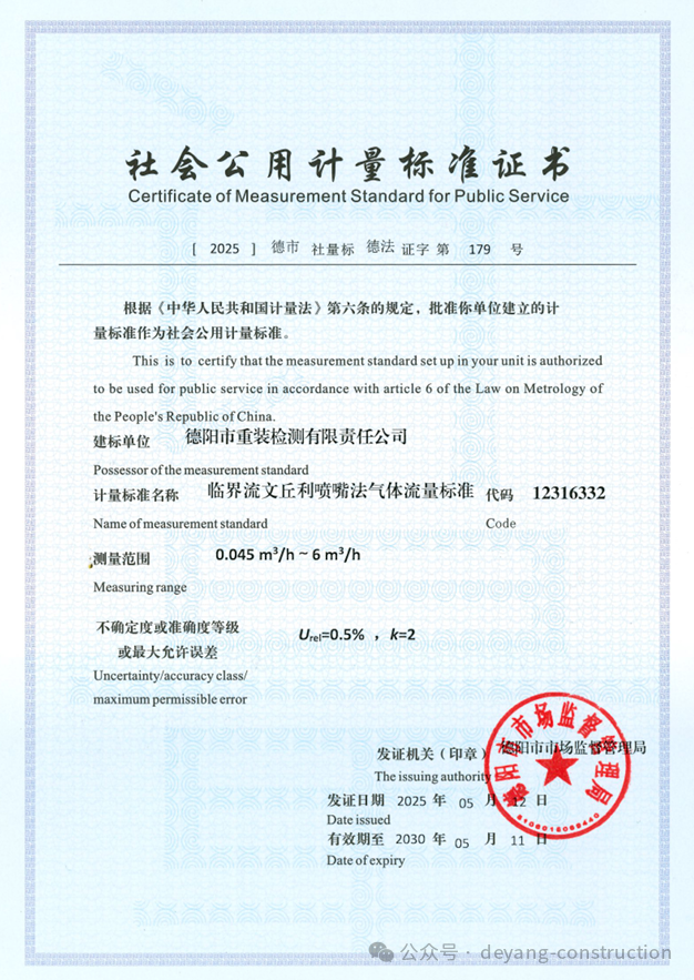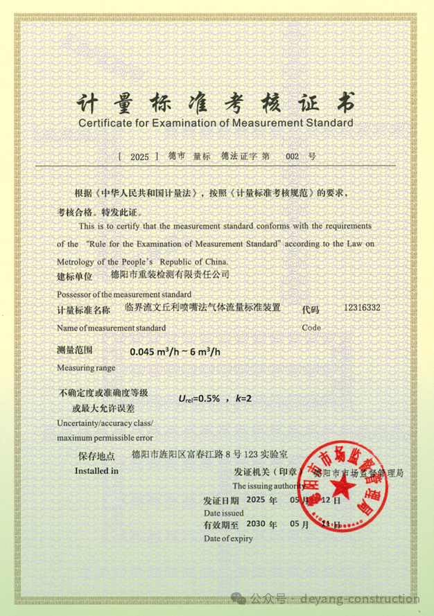 近日,德阳市重装检测有限责任公司经过严格的技术审查与现场操作评估,顺利通过德阳市市场监督管理局授权法定计量机构考核以及临界流文丘利喷嘴法气体流量标准装置新建标准考核,于5月13日成功获得膜式燃气表与超声波燃气表双项检定资质证书!